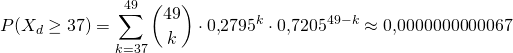 ![Rendered by QuickLaTeX.com \[ P(X_d\geq37) = \sum_{k=37}^{49} {49 \choose k} \cdot 0{,}2795^k \cdot 0{,}7205^{49-k} \approx 0{,}0000000000067 \]](https://www.rechenschieber-mainz.de/wp-content/ql-cache/quicklatex.com-fd8273d4401ab188156a74a97918db18_l3.png)